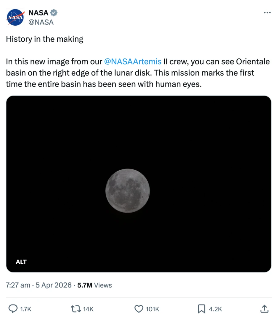 Астронавты «Артемиды-2» уже увидели части лунной поверхности, которые до этого не видел никакой другой человеческий взгляд. Ранним утром в воскресенье NASA опубликовало снимок, сделанный экипажем: на нем видна Луна с бассейном Моря Восточного (Mare Orientale). Он расположен на западной окраине полушария Луны, видно из Земли. Иногда это место называют Гранд-Каньоном Луны.